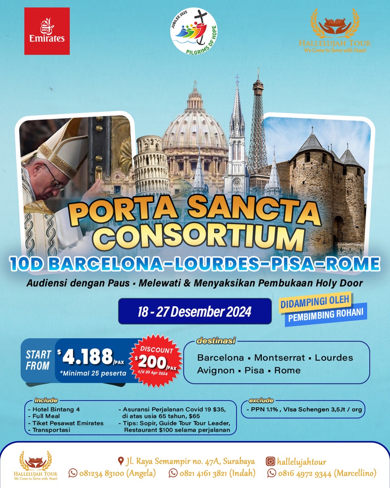 Setelah makan pagi di Hotel. Anda akan diajak untuk tour kota Rome salah satunya kita akan mengunjungi 3 gereja lainnya yang terdapat Holy Door didalamnya yaitu : Cathedral Lateran, Gereja Maria Maggiore, dan Gereja St Paul Germain. Setelah makan malam Anda akan diantar kembali ke Hotel. (MakanPagi/Siang/ Malam)