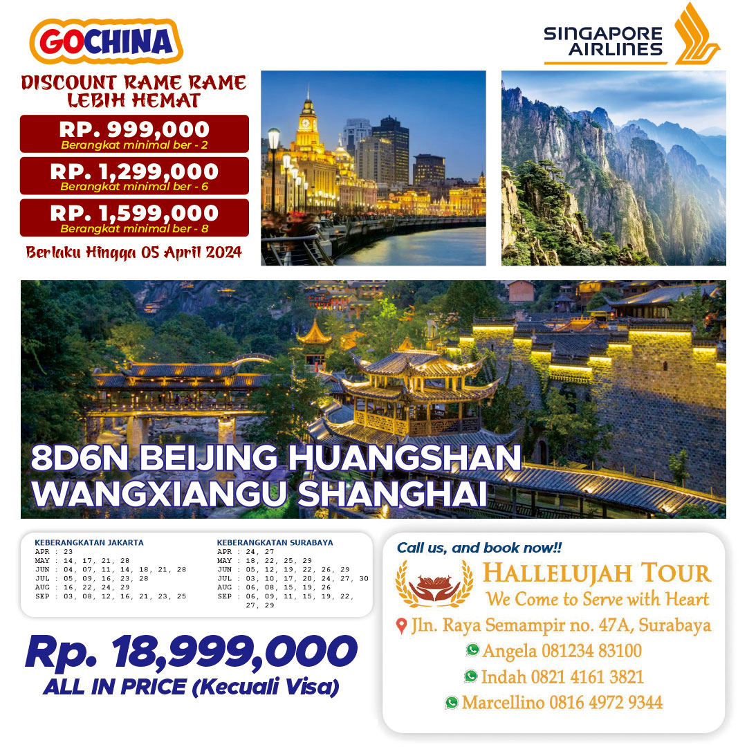 HARGA BELUM TERMASUK : - Biaya pengurusan Visa China - Pengeluaran Pribadi seperti Mini Bar, Telepon, Laundry dll - Tips Porter di hotel, airport & statsiun kereta, - Tour, Transportasi dan Makan tambahan di luar jadwal acara. - Biaya test Antigen/PCR sebelum keberangkatan apabila diperlukan. |